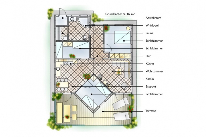Die Häuser liegen in kurzer Entfernung zur Stadt und zu den Seen. Sie verfügen über ein gepflegtes Wegenetz mit Landschaftsanbindung. Auch Vierbeiner sind hier herzlich willkommen. Das Erdgeschoss der 1- und 1,5- geschossigen Häuser ist durch seine Barrierefreiheit besonders kinderfreundlich und ideal für jeden, ob mit oder ohne Handicap, der Ruhe und Erholung sucht. Die 80 bis 100 qm große Wohnfläche mit gehobener Ausstattung enthält einen großzügigen Wohn- Ess- Küchenbereich, zwei bis drei Schlafzimmer, Dusche/WC, Sauna, Whirlpool und Kamin. Außerdem sind in jedem Haus ein Abstellraum und eine überdachte Terrasse verfügbar.