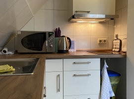 - Die Küchenzeile ist voll ausgestattet mit Doppelkochplatte, Kühlschrank, Mikrowelle, Kaffeemaschine, Wasserkocher, Toaster sowie ausreichend Geschirr, Besteck, Töpfen, Pfannen und Kochutensilien, ideal für Selbstversorger in Dresden.